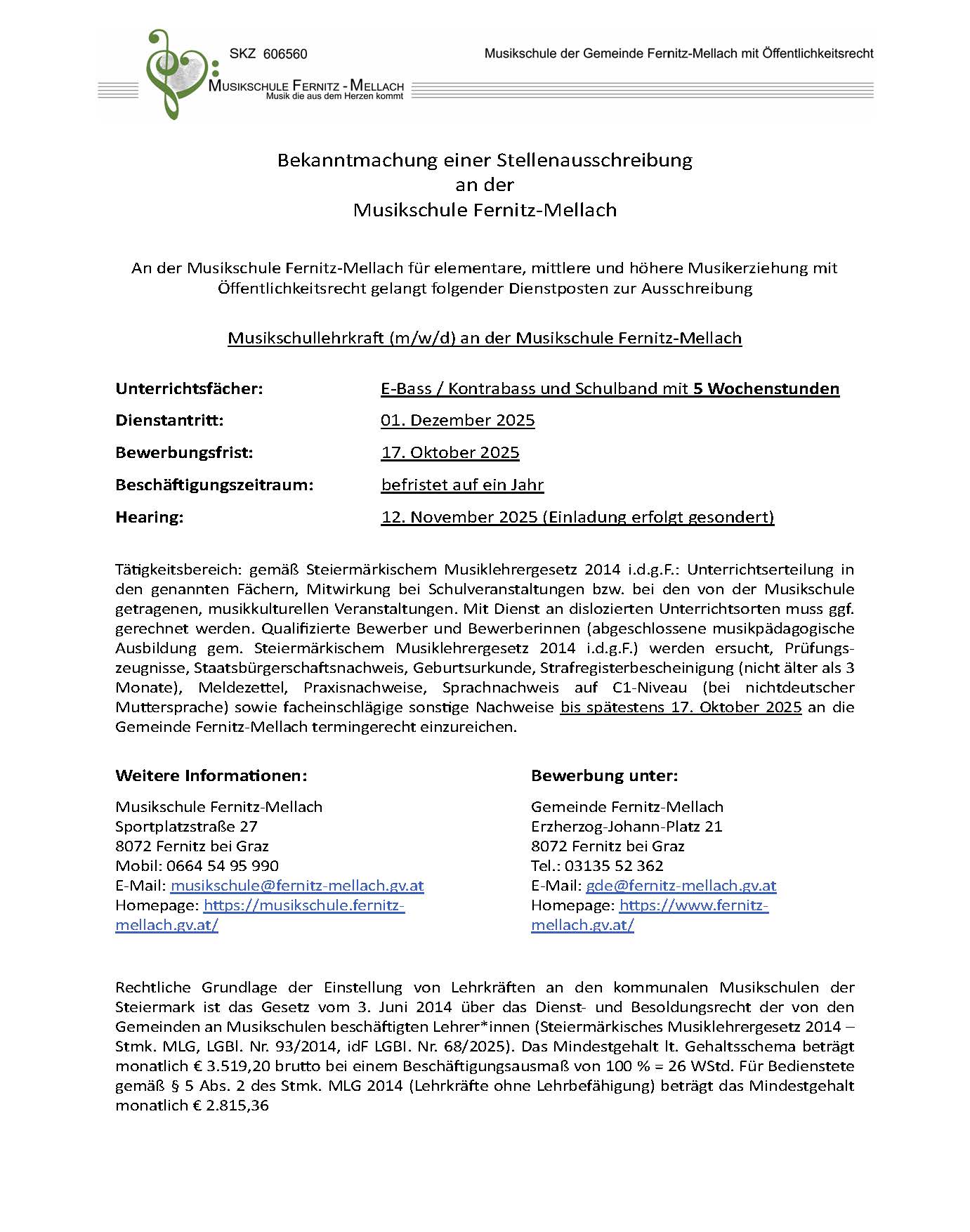 Hier finden Sie Stellenausschreibungen Musikschule Fernitz-Mellach Bekanntmachung Musikschullehrkraft (m/w/d) Unterrichtsfächer:E-Bass / Kontrabass & Schulband im Ausmaß von 5 WochenstundenDienstantritt:01. Dezember 2025Bewerbungsfrist:17. Oktober 2025Beschäftigungszeitraum:befristet auf ein JahrHearing: 12. November 2025 (Einladung erfolgt gesondert) 435 Schüler*innen 5 Standorte 28 Hauptfächer 33 Nebenfächer